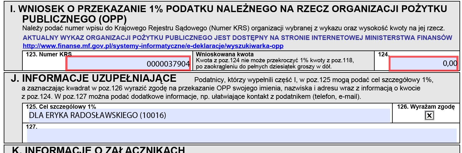 W rubryce "Informacje uzupełniające - cel 1%" - "Dla Eryka Radosławskiego (10016)"